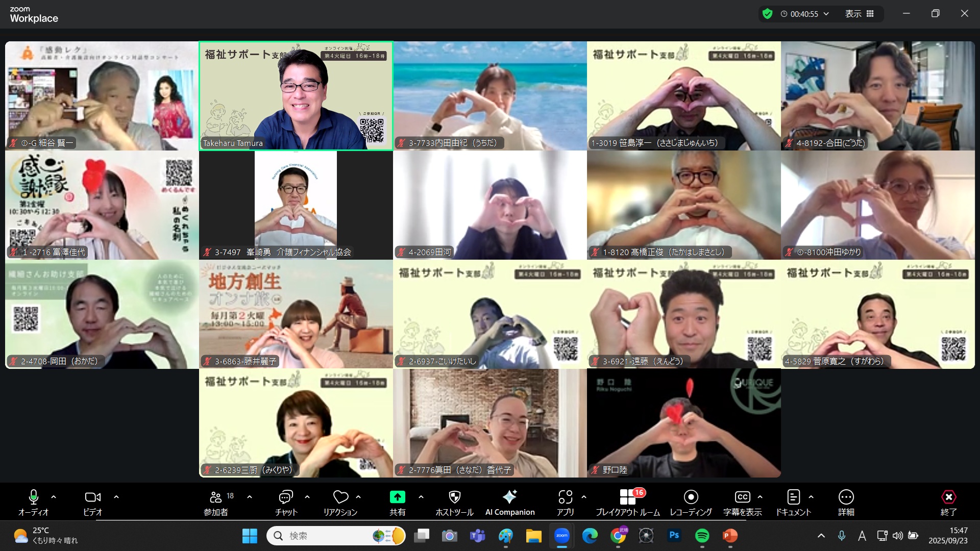 第63回福祉サポート支部月例会(2025.09.23)が無事おわりました。当日は「OA機器販売カテゴリーの遠藤直人さん」から「法人内介護相談窓口カテゴリーの小池大士さん」へ感謝状&推薦の言葉が発表されました。前回の7分コミュニケーション(ランダム1on1)から生まれたご縁が、「お母さまや遠藤さん自身の大きな安心」へつながりました。とてもいい時間でした。